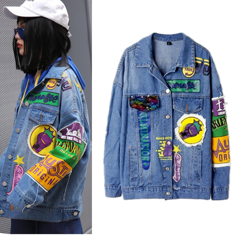 New Denim jacket women geek ROCK Letters print high street women outerwear coat Appliques oversized causal punk jackets NZ28